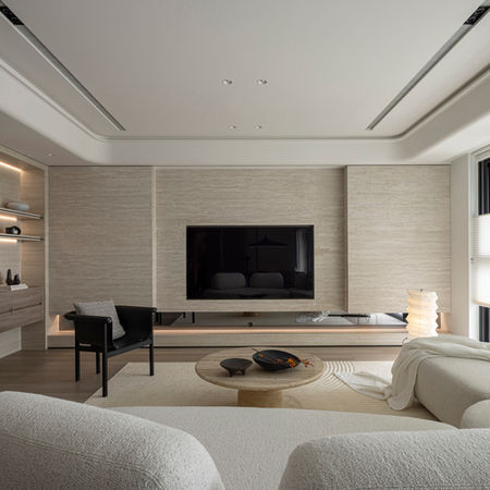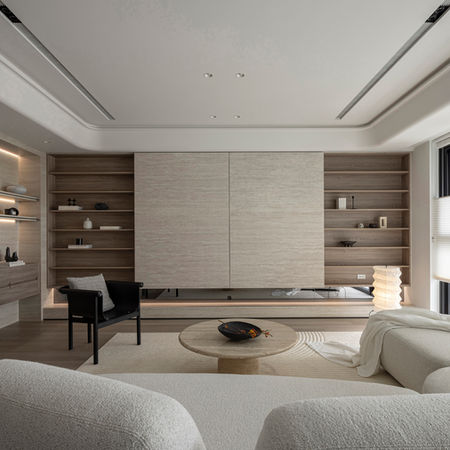 整體設計以低彩度材質為基底,透過石紋立面、木質紋理與間接照明的層層堆疊,建立細膩而克制的空間秩序。在比例、光影與留白的整體控制下,居所被轉化為一條具有節奏的生活軸線,使空間不僅承載機能,更成為情緒沉澱與時間流動的感知場域。