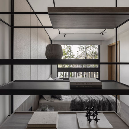 三樓主臥的空間語彙,延續了公領域的純粹與安穩,線性元素與塊體分配的平衡,營造沉靜而富層次感的氛圍。