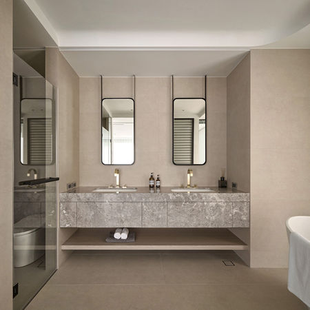 The master bathroom features a three-zone layout, exemplifying the efficiency of modern residential design. The transparent glass sliding doors, paired with adjustable blinds, allow for seamless transitions between openness and privacy, catering to diverse functional needs. The dual-basin vanity, integrated seamlessly with large-format stone tiles, exudes a quiet yet luxurious elegance—with its fine textures resembling nature’s artwork, further elevated by ambient lighting. Every material and texture has been meticulously curated to celebrate the rituals of everyday living.
