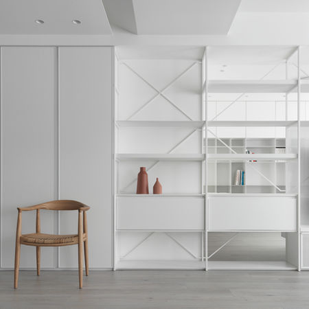 因業主從事網路電商的工作,必需增加一間工作室方便回家後可以繼續處理業務,另一方面想保有過去在國外偶而喝個調酒的習慣,所以在客廳後方則設定為minibars 讓平常在家也能夠像住在國的生活。