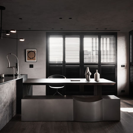 一進門刻意將玄關端景拉深,利用主動線劃開公私領域,牆面鑲嵌錯落有序光帶作為引導,在鞋櫃內植入光源利用沖孔鋼板透出的光線反射至鏡內,有如進入山洞後僅剩下一縷光線的意酒。