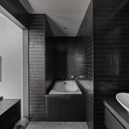 In the master bedroom, the designer opened up the space by knocking down the walls of the original bathroom, the open floor plan altered the common residential pattern, giving the user a vibe of living in a resort hotel. Black furniture items are tailored to fit the dapperness of the home owner.