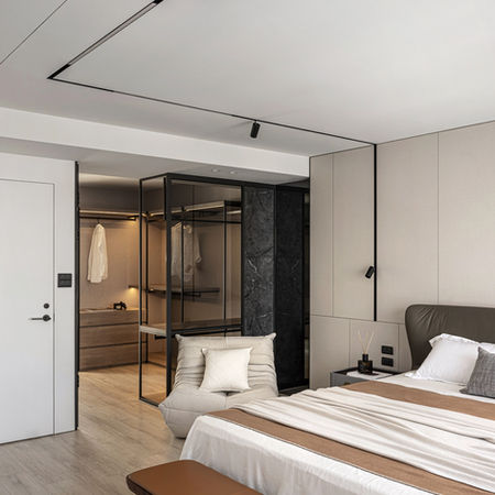 complemented by built-in storage that simplifies the spatial lines. On one side of the room, a walk-in closet with black-framed glass doors echoes luxury boutique aesthetics, delivering both transparency and sophistication.